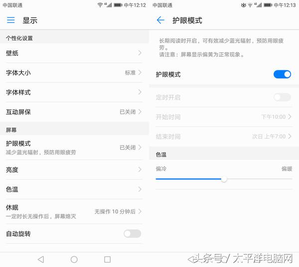 华为畅享7 Plus支持夜间护眼模式,用户可以选择手动开启或设定在规定时间内自动开启,通过减少屏幕蓝光辐射,可以预防青少年和重度用户的用眼疲劳,防止长时间使用手机屏幕对视力造成伤害,而且屏幕色温也可以手动调节。